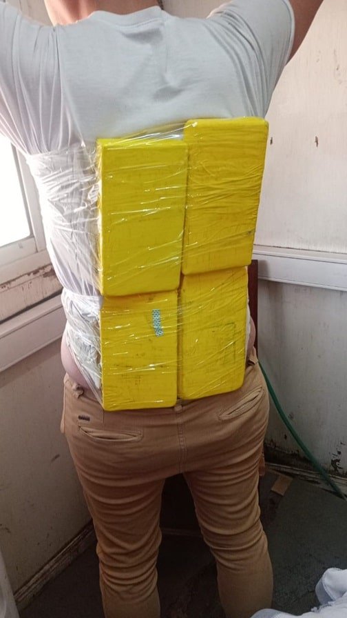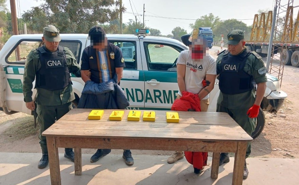 Tras el control, los gendarmes descubrieron que uno de los hombres llevaba cuatro paquetes rectangulares debajo de sus prendas de vestir, mientras que el otro escondía un “ladrillo” adosado al cuerpo, los cuales contenían una sustancia blancuzca. Las pruebas de campo Narcotest confirmaron la existencia de 5 kilos 259 gramos de cocaína.