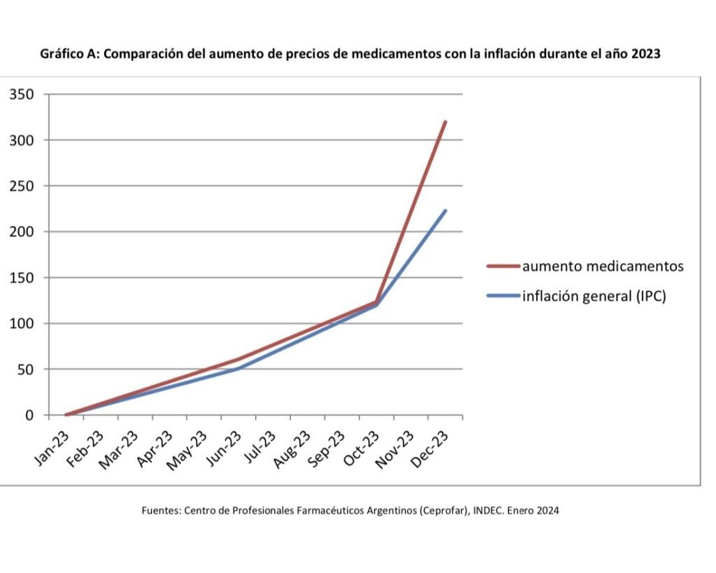 "Según cálculos del Centro de Profesionales Farmacéuticos de Argentina, la venta de medicamentos cayó un 19%. Esto significa que 2 de cada 10 personas hoy no están pudiendo acceder a los medicamentos que necesitan. Durante el 2023 el aumento de precios de medicamentos fue de 319%, es decir casi 100 puntos por encima del índice de inflación.