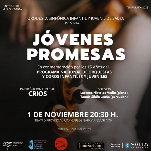 La Orquesta Sinfónica Infantil y Juvenil de Salta (OSIJS), a cargo de la directora artística Carolina Pineda Andrade, junto a invitados del interior y talleristas del Programa Nacional de Orquestas y Coros Infantiles y Juveniles de Salta, brindará el Concierto Regular “Jóvenes Promesas”; conmemorando los 15 años de implementación de dicho Programa en la Provincia.