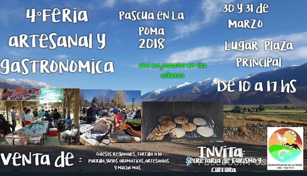 La Hora de SaltaInteriorLa PomaLa Poma: 4ta Feria artesanal y gatronómica La Poma: 4ta Feria artesanal y gatronómica 29/03/2018 - Actualizado: 15/05/2018 Más sobre: La Poma. Redes Sociales San Antonio de Los Cobres realiza su Feria campesina Emergencia agropecuaria en Salta Noticias relacionadas Encuentran una camioneta con una importante carga de hojas de coca La Poma: la provincia asiste a pequeños productores con forraje para ganado La Poma: 5to Festival Provincial de la Copla y Rally de la Copla Condena de 12 años de prisión para un hombre por abuso sexual y privación de la libertad La Poma: exdirectora de escuela condenada por malversación de dinero público La Poma: el Presidente Fernández junto al Gobernador Sáenz entregaron las primeras 15 casas del programa Habitar Comunidad Deja una respuesta Cancelar la respuestaTu dirección de correo electrónico no será publicada. Los campos obligatorios están marcados con * Guarda mi nombre, correo electrónico y web en este navegador para la próxima vez que comente. Subir