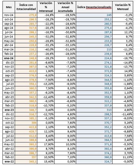 De esta forma, el acumulado de enero-noviembre de 2024 cerró 28,5% por debajo del mismo período del año anterior.