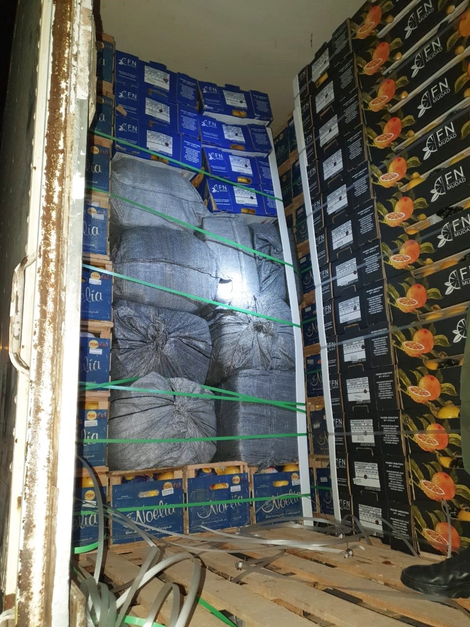 Al observar el semirremolque, los gendarmes vieron a simple vista un cargamento de cítricos pero durante las pesquisas descubrieron un encofrado con 30 bolsas tipo arpillera que estaban ocultas entre 1.430 cajas.
