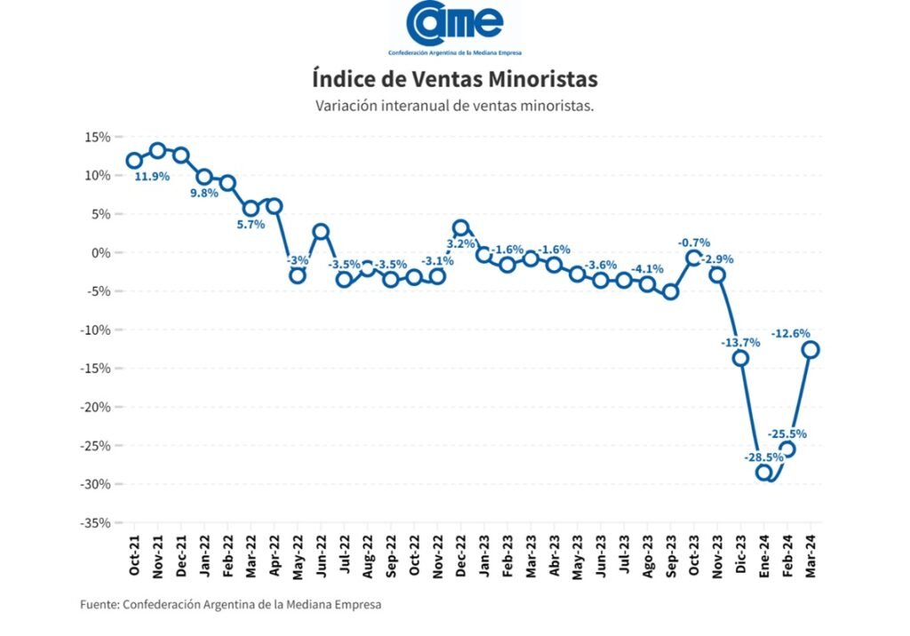 Así surge del Índice de Ventas Minoristas Pymes de la Confederación Argentina de la en Mediana Empresa (CAME), elaborado en base a un relevamiento mensual entre 1.350 comercios minoristas del país, realizado del 3 y 5 de abril