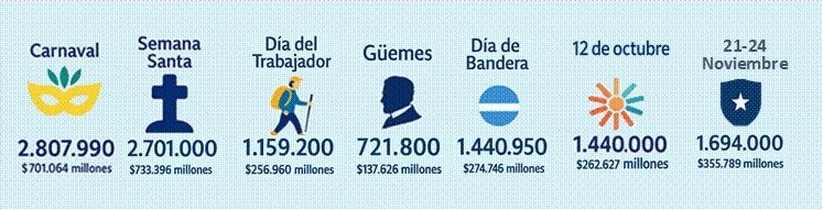 El gasto promedio diario se estimó en $ 77.000 por persona. El movimiento estuvo fuertemente dinamizado por una amplia agenda de eventos, entre los que se destacaron el 8° Festival de la Caña de Azúcar en Leales; el PlumFestival Internacional de Cine de Animación en Tafí del Valle; el Seven de Rugby de Yerba Buena; el Congreso Nacional de Abogacía Joven; el VII Encuentro Nacional de Mixed Ability Rugby y Hockey; la 2ª Competencia Gastronómica Sabores al Disco en San Pedro de Colalao, y el Torneo Final Nacional de Tiro al Arco en la capital. Además, los visitantes aprovecharon los atractivos emblemáticos de la provincia, como el Cerro San Javier, los paisajes de altura y lagos de El Cadillal, y los circuitos naturales y gastronómicos de Tafí del Valle, consolidándose como destinos protagonistas del fin de semana.