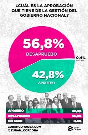 En particular, el relevamiento del que participaron 1.3000 personas también señala que la imagen del Presidente también empeoró: el 57,5% tiene una imagen negativa de Milei y el 41,9% positiva. Un 42,8% de los encuestados mantiene su apoyo a la gestión libertaria.