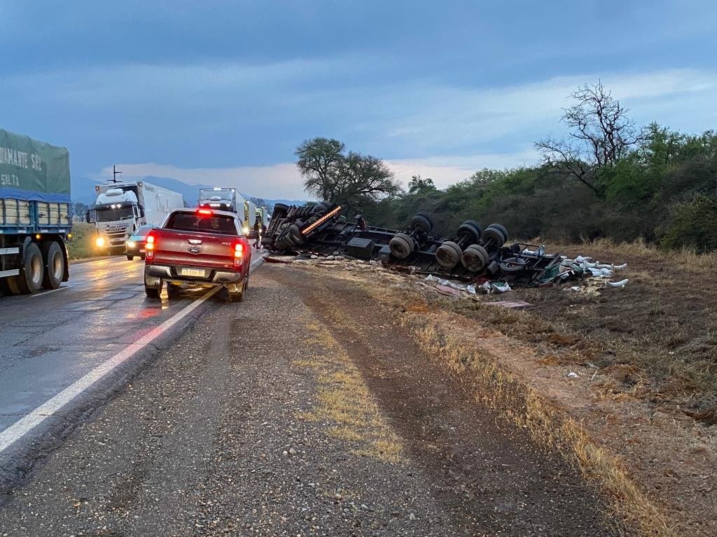 En horas de la tarde de ayer después de las 19, un llamado al Sistema de Emergencias 9-1-1 alertó sobre el vuelco de un camión en ruta nacional 9/34 altura del kilómetro 1445. Por lo que se desplazaron recursos policiales al lugar constatando que se trataba de un camión de gran porte que circulaba de Sur a Norte, y por motivos que se buscan establecer volcó sobre uno de sus lados.
