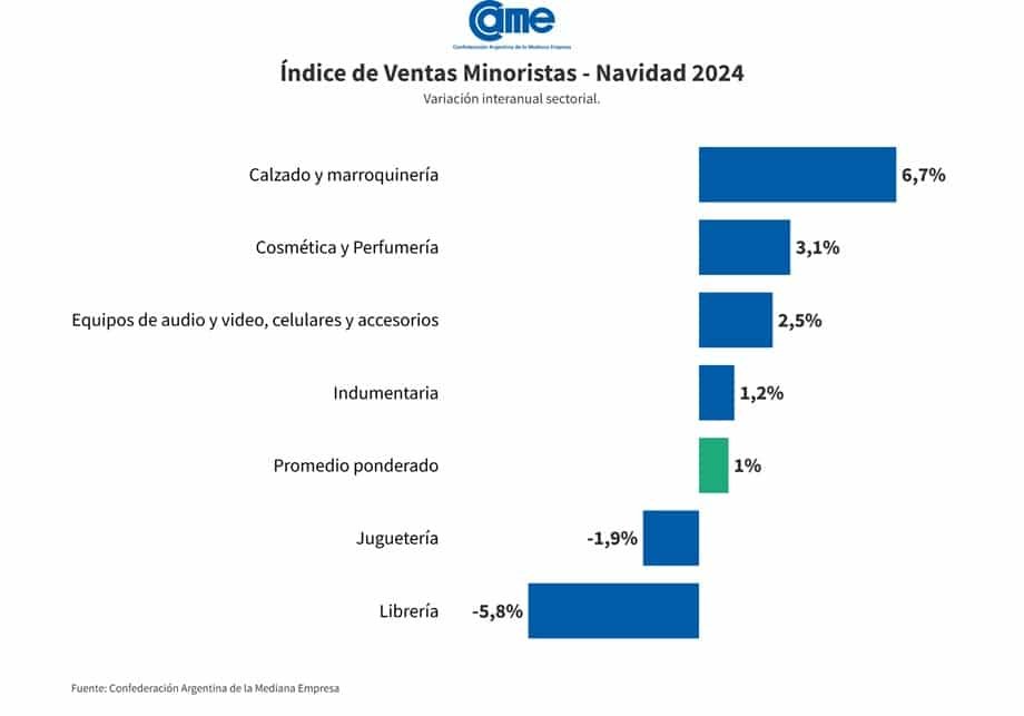 De los 6 grandes rubros relevados, crecieron Calzado y marroquinería (+6,7), Cosmética y Perfumería (+3,1%), Equipos de audio, video, celulares y accesorios (+2,5%), e Indumentaria (+1,2%). En cambio, cayeron Librería (-5,8%) y Juguetería (-1,9%).