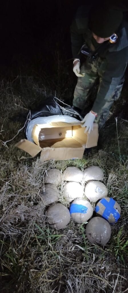 Ante esa situación, los funcionarios emplearon un rastrillaje en el que hallaron un bulto entre la vegetación. Dentro del elemento hallado, detectaron 10 paquetes que estaban embalados con cinta con una sustancia vegetal en su interior.
