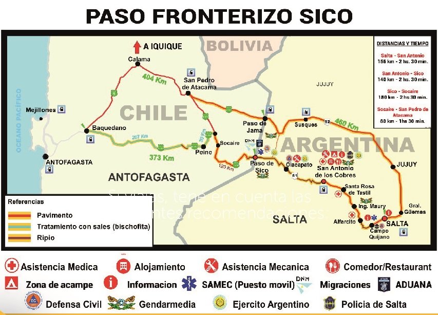 Respecto al abastecimiento de combustible, se recomienda proyectar el consumo del vehículo según las distancias a recorrer, ya que en Chile el primer punto de reposición es en San Pedro de Atacama.