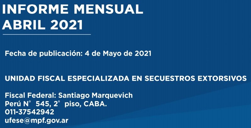 La Unidad Fiscal Especializada en Secuestros Extorsivos fue creada mediante la Resolución PGN N°1583/2016. Dentro de sus funciones principales se cuenta “el relevamiento, la centralización, la sistematización y el análisis de la información criminal vinculada con las regularidades delictivas, lugares y personas involucradas en los casos, con el fin de optimizar la intervención en la investigación penal del Ministerio Público Fiscal y aportar la información relevada a otras agencias del Estado con el objeto de implementar medidas de prevención, diseñar la política criminal adecuada y llevar adelante acciones concretas que permitan hacer frente a este complejo fenómeno delictivo”. Los datos relevados que no guardan información sensible pueden ser consultados en la sección “Informes y Datos” del sitio web oficial de la Unidad Fiscal Especializada: https://www.mpf.gob.ar/ufese/recurso/.