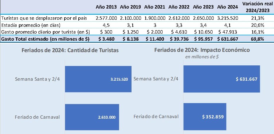 El feriado XXL que combinó Semana Santa con el Día del Veterano y los Caídos en Malvinas fue muy bueno para el sector turístico. Viajaron 3,2 millones de personas en los seis días que duró el fin de semana y gastaron $631.667 millones en alimentos, bebidas, alojamiento, transporte, recreación y compras diversas.