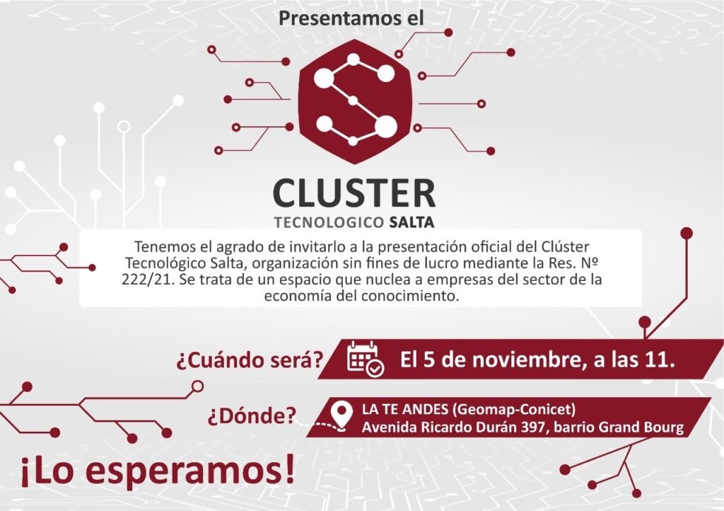 Se trata el primer Clúster Tecnológico Salta, un espacio que nuclea a empresas del sector de la economía del conocimiento, con el objetivo de promover servicios y beneficios para sus miembros y generar diversas iniciativas en conjunto. El evento será el viernes 5, a las 11, en LA TE ANDES (Geomap-Conicet), avenida Ricardo Durán 397 Barrio Grand Burg.