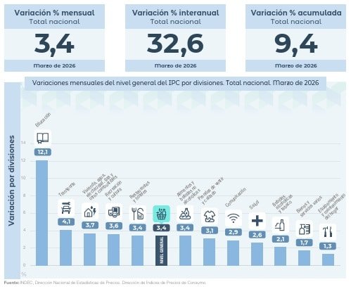 La inflación de marzo superó el umbral clave del 3% por primera vez en un año, al alcanzar el 3,4% y ya acumula diez meses consecutivos, según informó el Instituto Nacional de Estadística y Censos (INDEC). El principal impulso llegó de las tarifas y la educación, en el mes de la vuelta a clases; aunque también fue clave el salto del precio del barril del petróleo que impactó directo en el combustibles, producto de la guerra en Medio Oriente.