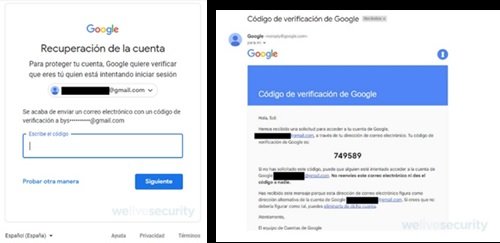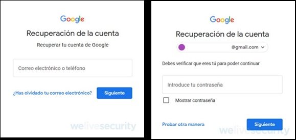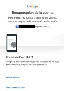 Si efectivamente no se puede recuperar la cuenta de Gmail ya que la contraseña ha sido vulnerada y modificada; es muy probable que además el cibercriminal haya modificado los otros medios de recuperación. Sin embargo, existe una posibilidad de recuperar la cuenta: si en el dispositivo móvil aún se tiene configurada la cuenta de Gmail como cuenta principal. De ser así, ingresando al centro de recuperación, se indica cuál es la cuenta de Gmail a recuperar y se selecciona “Siguiente”. También se ingresa la última contraseña que se recuerde haber ingresado. Luego, a pesar de ingresar una contraseña que no sea correcta (ya que el cibercriminal la modificó) se brinda la opción de verificarlo a través del dispositivo configurado como segundo factor de autenticación.