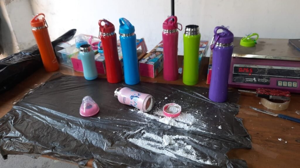 Ante este hecho, los funcionarios profundizaron el control la requisa ante testigos y hallaron seis botellas térmicas deportivas y dos mamaderas que contenían una sustancia pulverulenta blanca, la cual resultó ser cocaína (1 kilo 021 gramos), según las pruebas efectuadas por personal de Criminalística y Estudios Forenses.