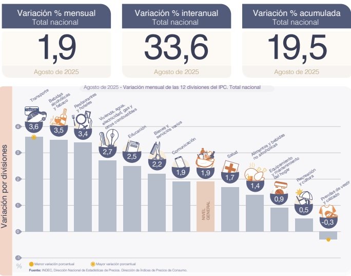 La inflación de agosto se mantuvo en 1,9% y se ubicó debajo del 2% por cuarto mes consecutivo, según informó este miércoles el Instituto Nacional de Estadística y Censos (INDEC). La variación de precios acumuló un 19,5% en los primeros ocho meses del año y la interanual se desaceleró al 33,6%, marcando su nivel más bajo desde julio 2018. Durante el octavo mes del año, el "pass-through" continuó siendo bajo tras la escalada del dólar durante julio (+14%) y el leve recorte de agosto (-1,9%).