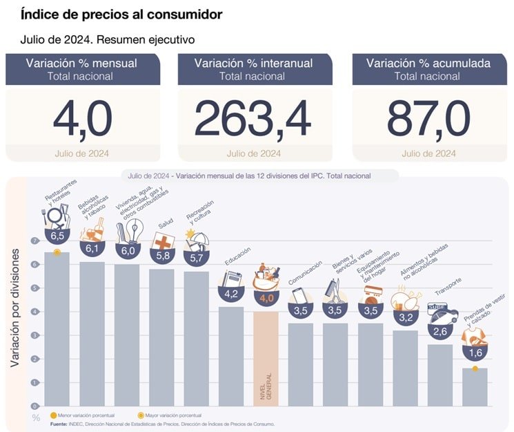 La inflación de julio se ubicó en el 4% mensual y de esta forma volvió a la senda bajista, después de haber interrumpido el proceso cuando en junio subió al 4,6%. Pese a esto el acumulado del año asciende a 87%, mientras que la suba de precios interanual está en el nivel del 263,4%, informó este miércoles 14 de agosto, el Instituto Nacional de Estadística y Censos de la República (INDEC).
