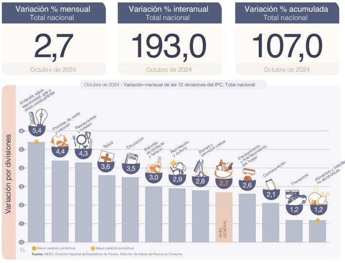 La inflación de octubre logró perforar el tan ansiado 3%. La medición incluso estuvo más baja que el REM y algunas consultoras, ya que se ubicó en el 2,7%. Pero no solo eso, el IPC también logró quebrar el 200% interanual que, en esta oportunidad, fue del 193%, según informó este martes 12 de noviembre el Instituto Nacional de Estadística y Censos de la República Argentina (INDEC).