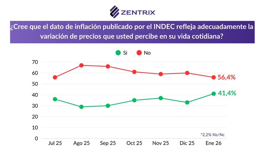 n el mismo sentido, el relevamiento muestra que la inflación también se discute en el plano de la credibilidad; el 56,4% de los encuestados no cree que el dato del INDEC refleje lo que se vive en la calle, mientras que el 41,4% sí considera que el índice oficial se acerca a su percepción cotidiana.
